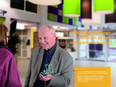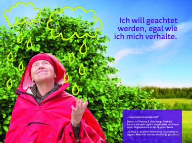 roten Regenponcho in das Tageszentrum. „Ja, Frau S., es könnt schon sein, dass es heute regnet. Aber hier drinnen sind Sie ja geschützt.“