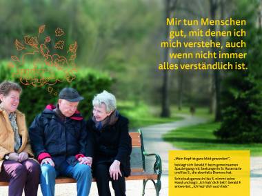 „Mein Kopf ist ganz blöd geworden!“, beklagt sich Gerald F. beim gemeinsamen Spaziergang mit Seelsorgerin Sr. Rosemarie und Ilse S., die ebenfalls Demenz hat. Schicksalsgenossin Ilse S. nimmt seine Hand und sagt: „Ich hab‘ dich lieb“. Gerald F. antwortet: „Ich hab‘ dich auch lieb.“
