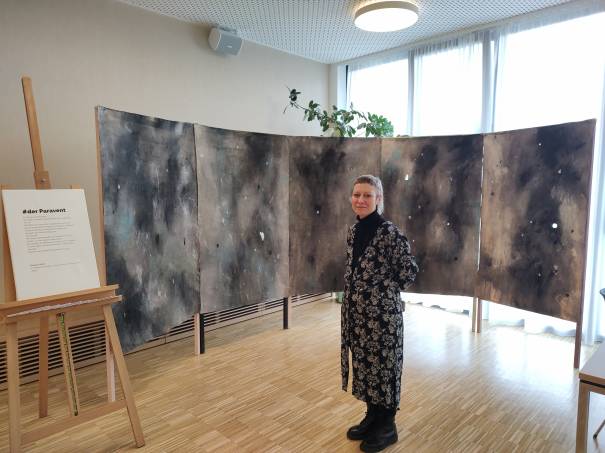 Das sich im Entree der CS Kalksburg befindliche Café Schlössl verwandelt sich in der Fastenzeit in eine Kunsthalle. Der fünfteilige Paravent von Barbara Stöhr mit dem Titel "Im nächsten Leben mache ich alles anders" lädt Bewohner:innen, Angehörige und Besucher:innen des neuen Pflegezentrums ein, in Beziehung mit dem Kunstwerk zu treten.