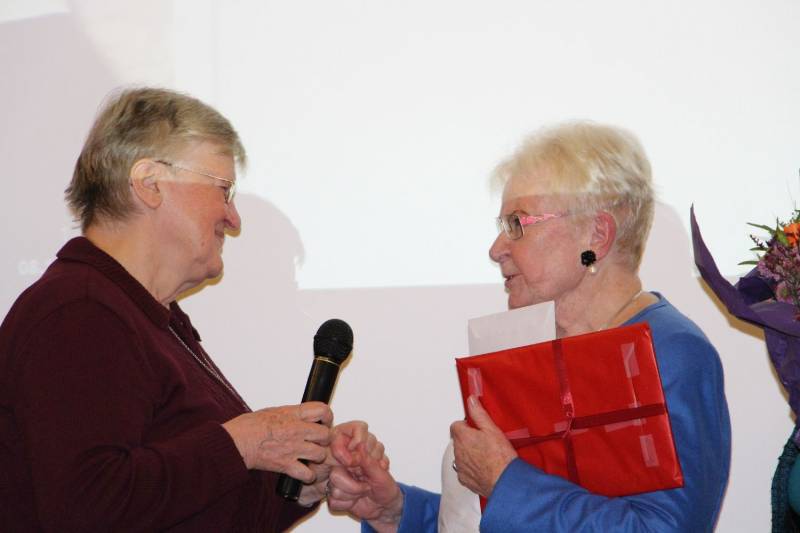 Sr. Susanne Krendelsberger CS, Generalleiterin der Schwesterngemeinschaft überreicht den Hildegard-Burjan-Ehrenpreis an Prof. Ingeborg Schödl.