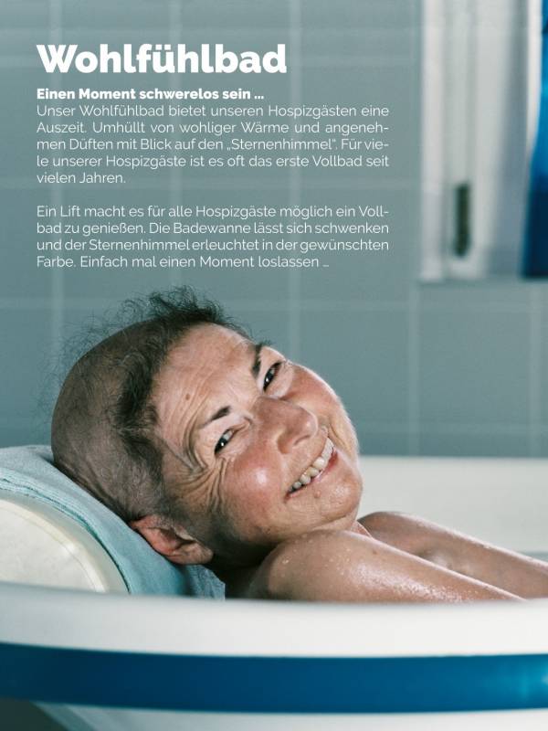 Zwei Verabschiedungsräume „Raum der Stille“ geben Angehörigen Raum und Zeit, um sich von ihren Liebsten zu verabschieden. Einen Moment schwerelos sein, das ist möglich im neuen barrierefreien Wohlfühlbad. Mehr und größere Aufenthalts- und Büroräume verbessern die Lebensqualität für Hospizgäste und ihre Angehörigen und auch die Arbeitsbedingungen für 56 MitarbeiterInnen und 93 Ehrenamtliche.